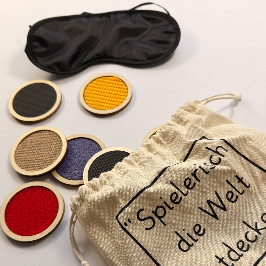Verschiedene Oberflächen ertasten und blind zuordnen – inklusive Schlafmaske zum Augenverbinden.
