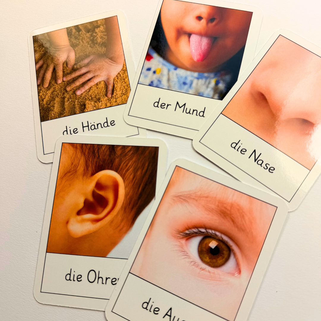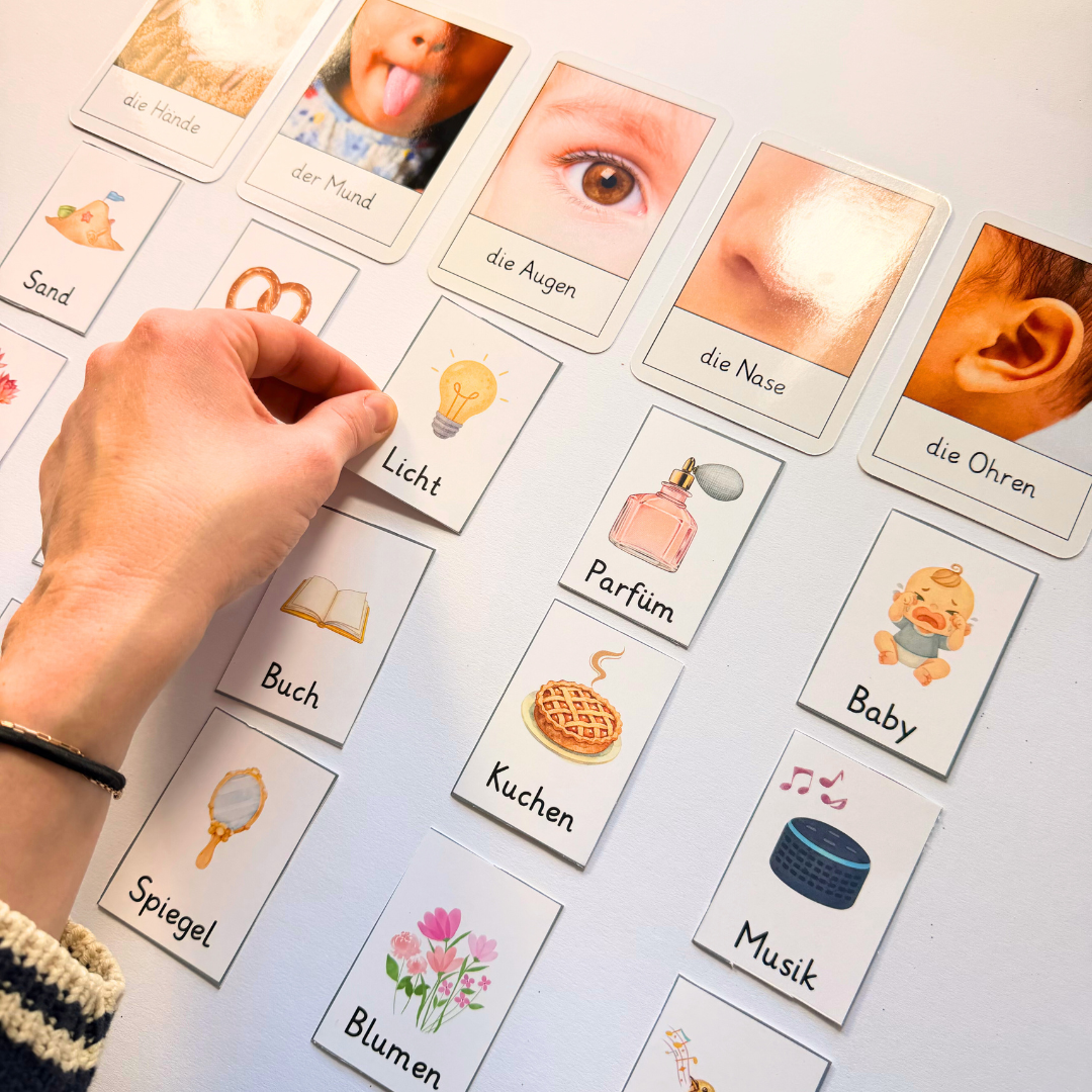Fünf liebevoll gestaltete Karten: Vorderseite Körperteil, Rückseite passender Sinn.