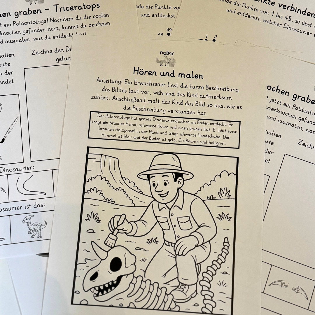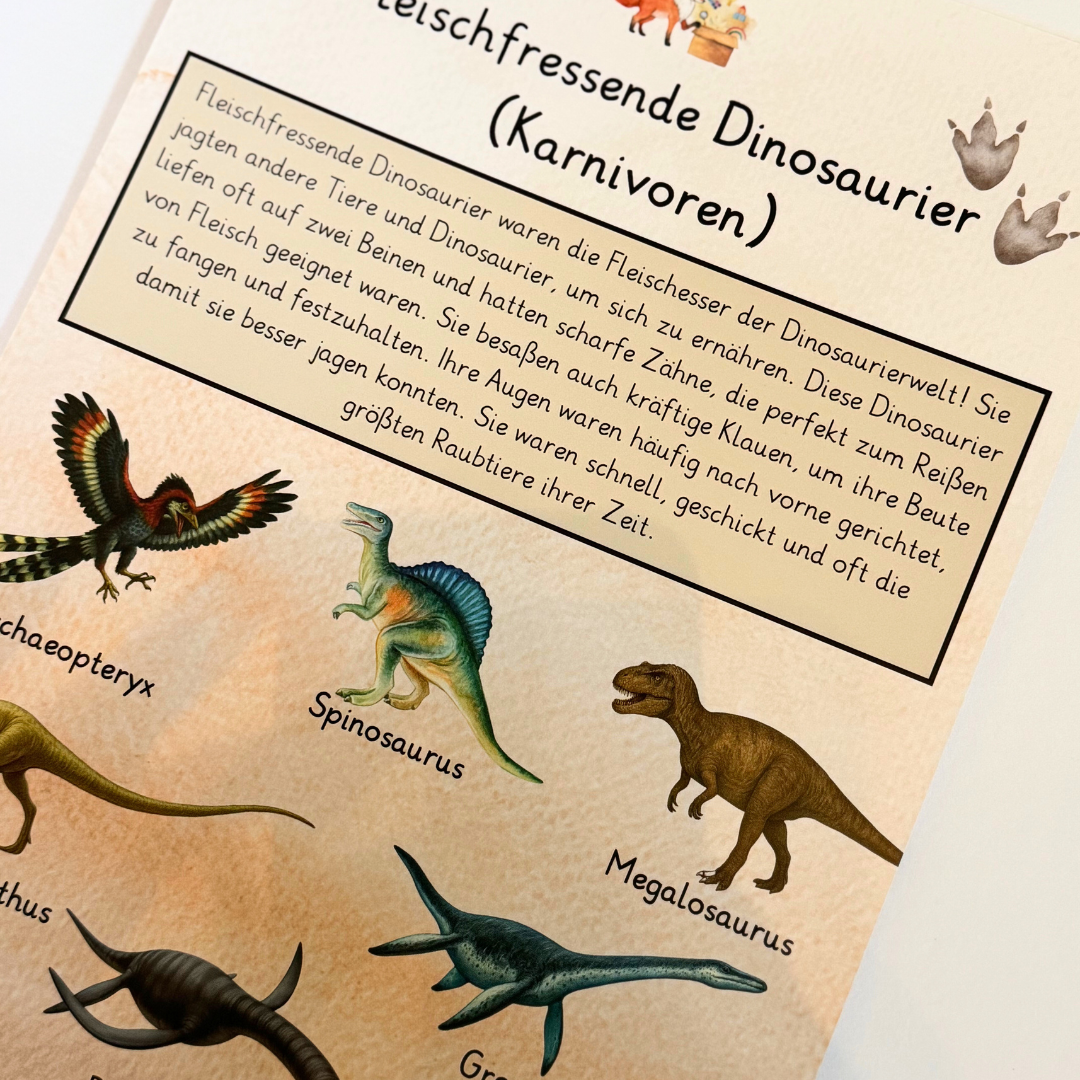 Mit vielen kreativen und wissensreichen Aktivitäten lernen Kinder spielerisch, wie Fleisch- und Pflanzenfresser unterschieden werden, wie ein Vulkan ausbricht, wie ein Dino-Ei beschützt wird – und wie man sich mit Kunst, Würfelspiel und Holzpuzzle auf die Spuren dieser faszinierenden Lebewesen begibt.